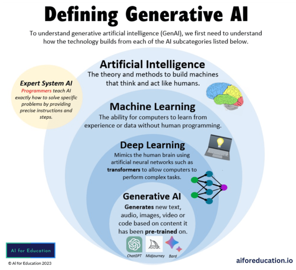 Since the start of this year, I have done a rather deep dive into the world of artificial intelligence. My PhD studies in educational technology have leant to my interest in this fast-changing and ever-growing technological trend. Something I have learned from research, podcasts, and webinars related to AI is how to navigate the language and framework of the subject. Here are a couple of helpful images to illustrate the AI landscape.